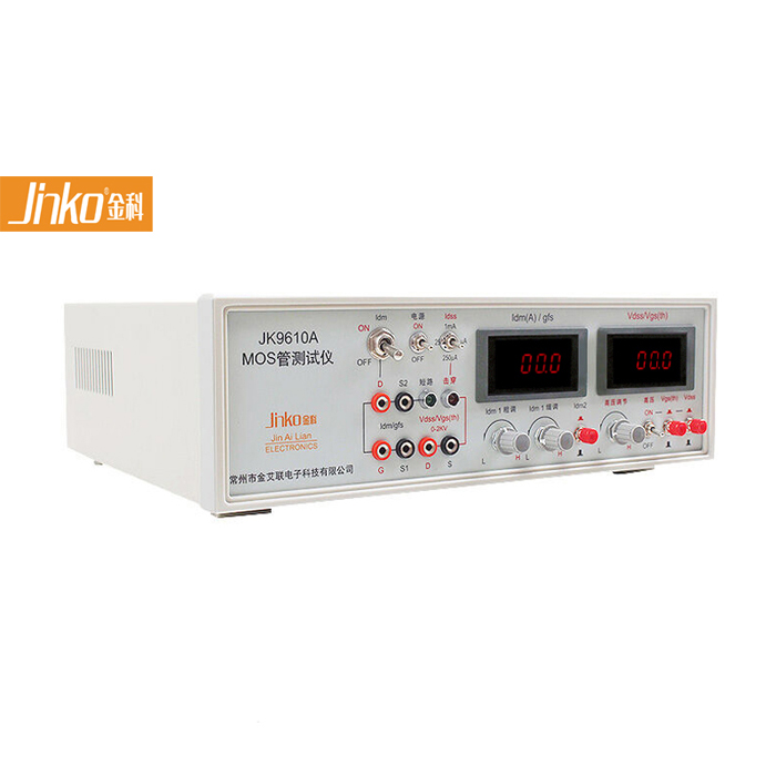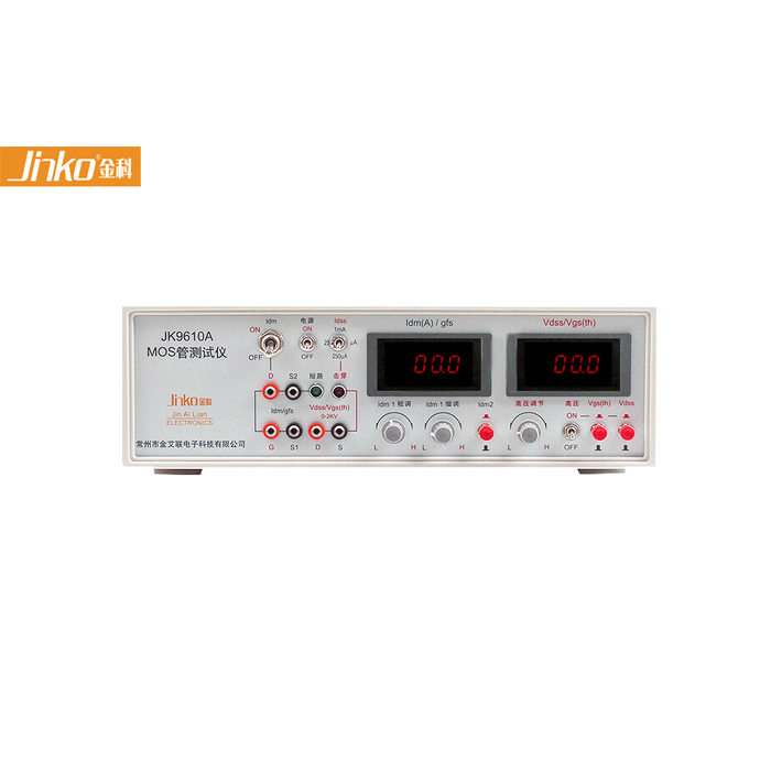 JK9610A型功率场效应管测试仪,是一种新颖的全数字显示式功率场效应管参数测试装置,可用于标称 电流约在2-85A,功率在300W以内的N沟导功率场效应管主要参数的测试。它可以准确测量击穿电压 VDSS、栅极开启电压VGS(th)和放大特性参数跨导Gfs,尤其是跨导Gfs的测试电流可以达到50A,由于采 用脉冲电流测试法,即使在大电流测试时也不会对被测器件造成任何损坏,更可以在大电流状态下对场效 应管进行参数一致性的测试(配对);仪器完全可用于同等电流等级的IGBT参数的测量;仪器还是一台性 能十分优越的电子元器件耐压测试装置,其测试耐压时的漏电流有1mA、250uA、25uA 三挡可以选择。仪器 主要用于功率场效应管和IGBT的质量检验、参数的配对及其它电子元器件的耐压测试之用。仪器为N沟导型测试仪。仪器外型美观、性能稳定、测量准确、操作简单、使用安全方便。